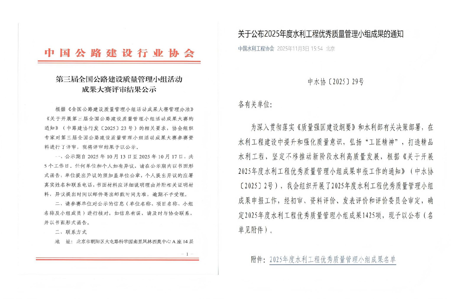 近日,中國公路建設行業協會、中國水利工程協會先后公布了第三屆全國公路建設質量管理小組活動成果評審結果和2025年度水利企業質量管理小組競賽活動結果。“···